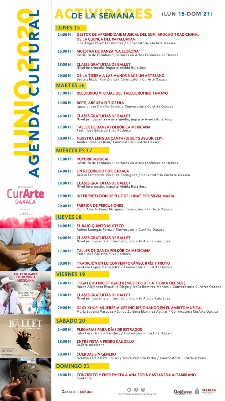 También, el miércoles 17 de junio podrán realizar “Un recorrido por Oaxaca”, sin salir de casa, a las 14:00 horas, y deleitarse con la “Fabrica de percusiones” a las 20:00 horas. El jueves se presentarán los proyectos “El bajo quinto mixteco” y “Tradición de lo contemporáneo: Raíz y Fruto” en los mismos horarios.