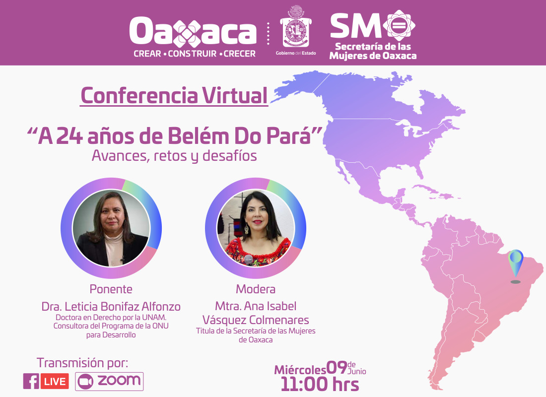 Oaxaca de Juárez, Oax. 8 de junio de 2021. A fin de visibilizar los avances a la protección, la observancia, la promoción, el estudio y la divulgación de los derechos humanos que ampara el orden jurídico mexicano para las mujeres, la Secretaría de las Mujeres de Oaxaca (SMO) invita a presenciar la conferencia virtual titulada “A 24 años de Belém do Pará: Avances, Retos y Desafíos”, este miércoles 9 de junio a las 11:00 horas.