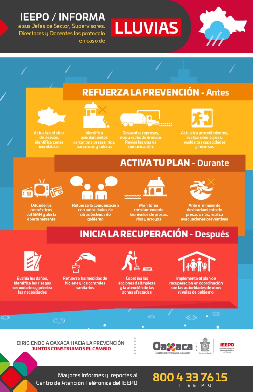 El IEEPO exhorta a los directores y maestros de los planteles para estar atentos a la información que emita la CEPCO, sobre la presencia de estos eventos naturales y en caso de ser necesario, de acuerdo con las valoraciones que se realicen en conjunto con la autoridad municipal y padres de familia, suspender clases de manera preventiva.