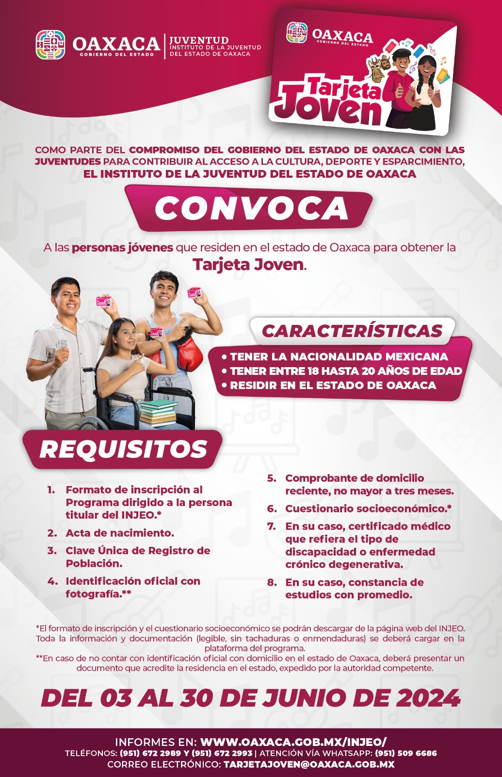 Oaxaca de Juárez, Oax. 15 de junio de 2024.- El Instituto de la Juventud del Estado de Oaxaca (injeo) convoca a hombres y mujeres de entre 18 a 20 años de edad, a registrarse de manera gratuita y sin intermediarios al programa Tarjeta Joven.