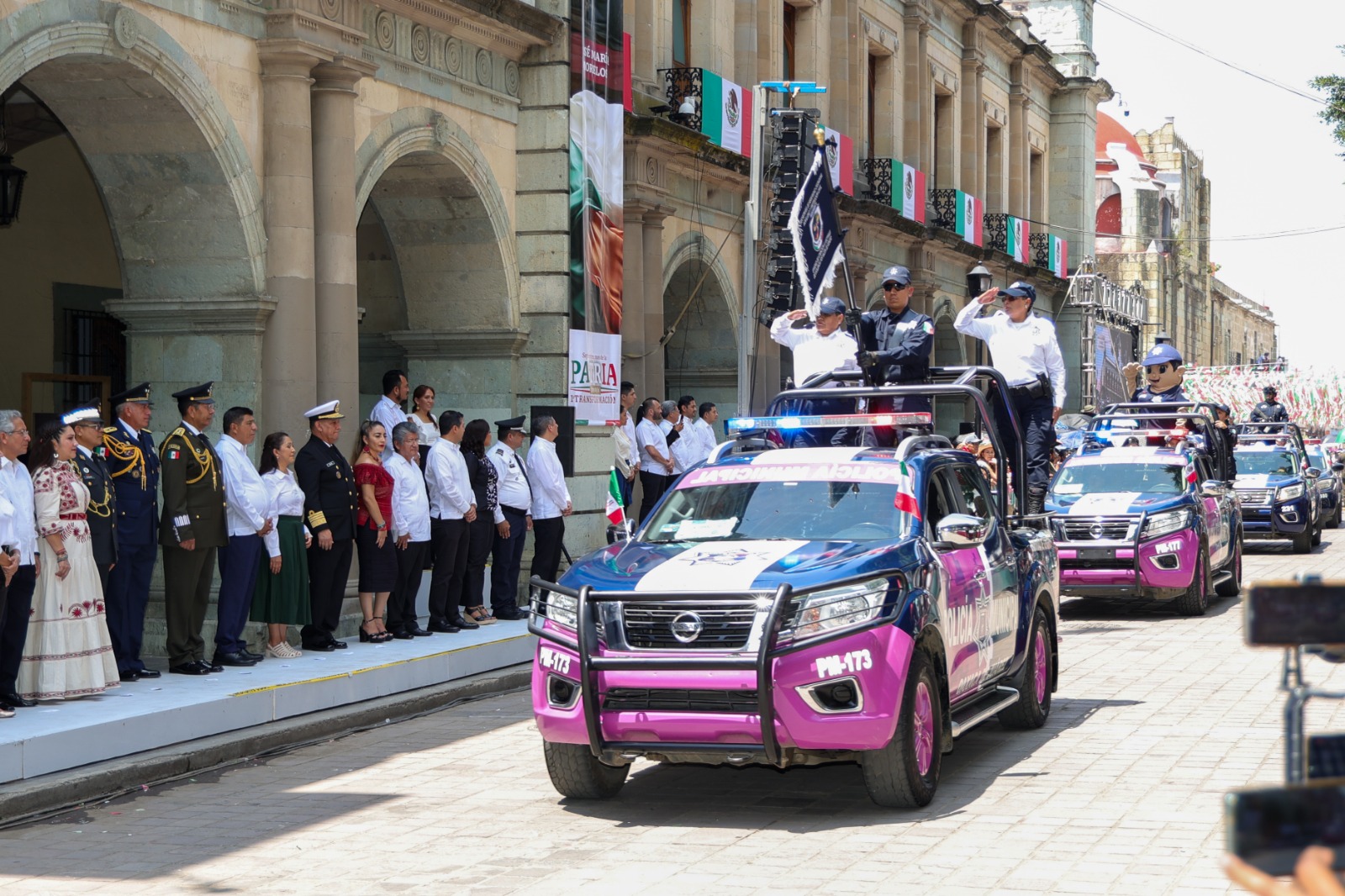 - El Gobernador Salomón Jara Cruz y autoridades militares y civiles presenciaron la parada militar desde los portales de Palacio de Gobierno al nivel de miles de personas que se dieron cita en las principales calles de la capital